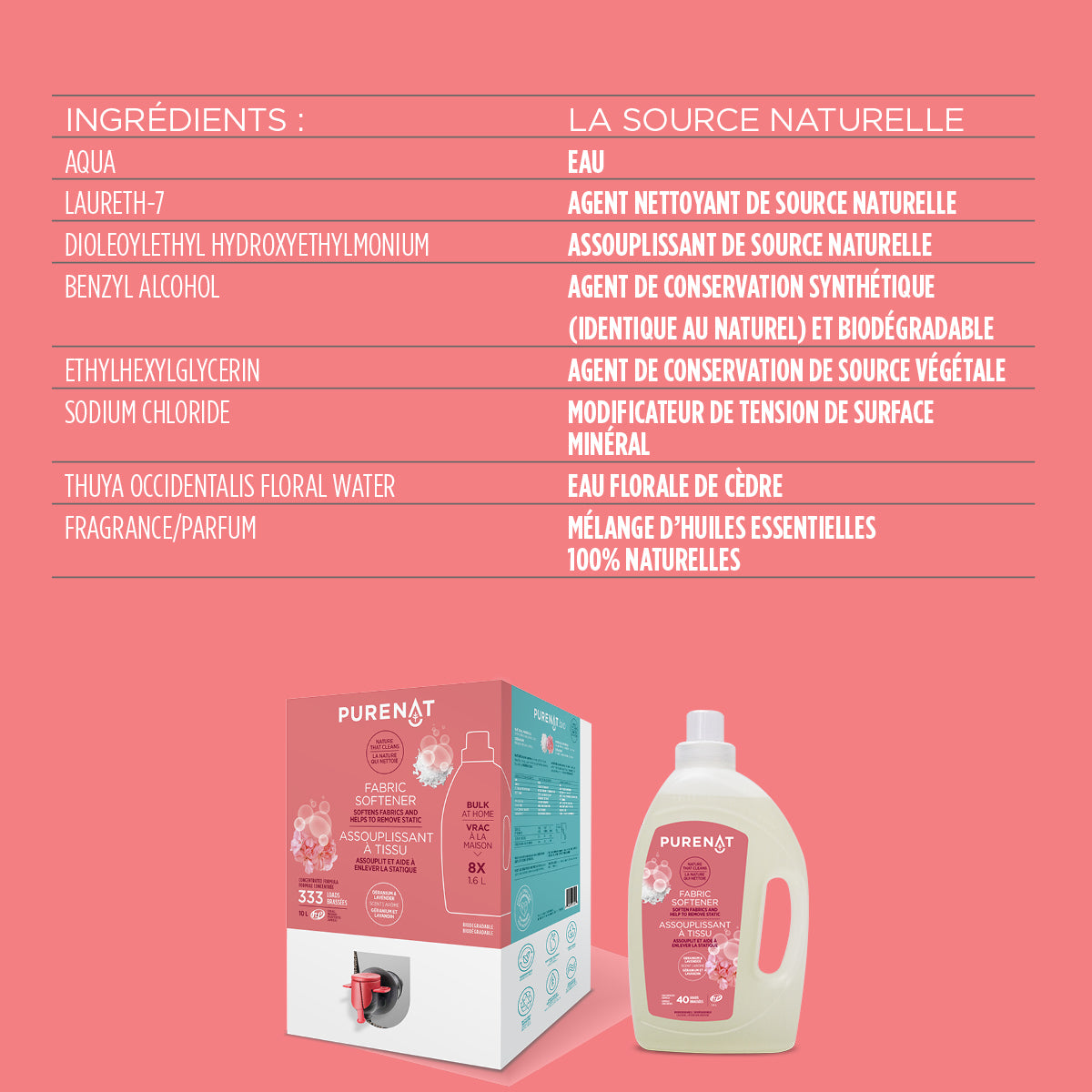 Fait à 100% d’huiles essentielles, l’assouplissant à tissu est efficace pour tous les types de laveuse, dont les laveuses HE. Son arôme de lavandin et géranium s’agence parfaitement avec nos deux détergents à lessive. Fait d’ingrédients de source naturelle, ce produit contient des minéraux qui aident à assouplir les tissus et à prévenir la statique.