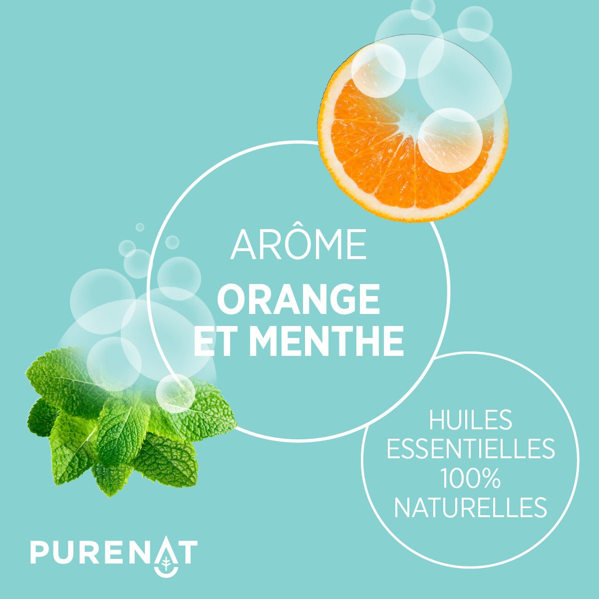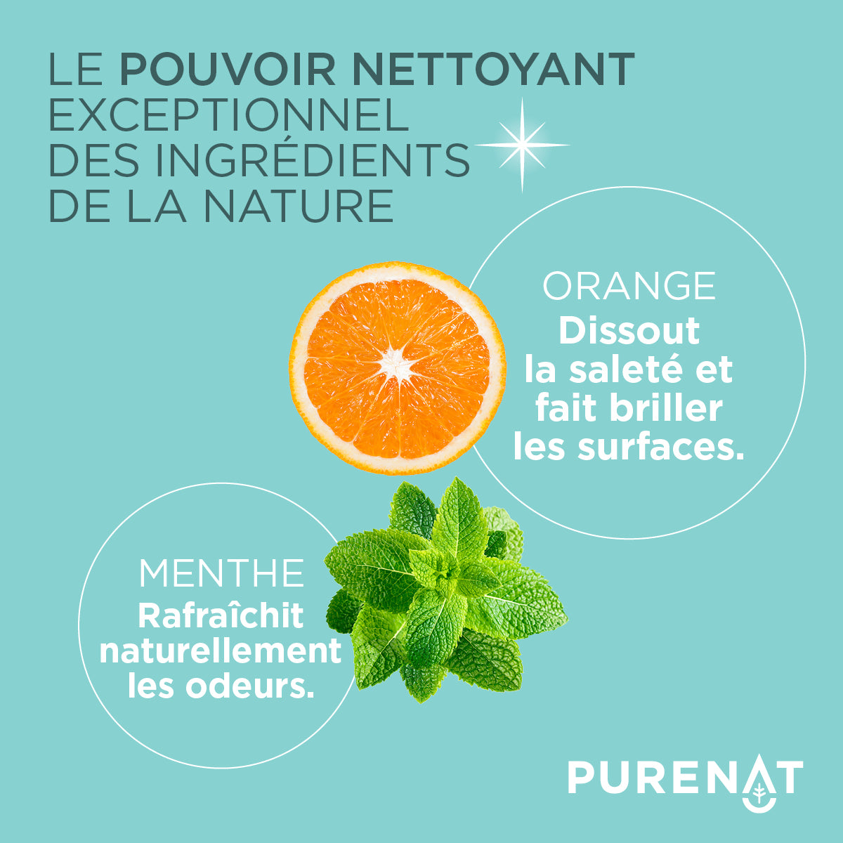 • Nettoie naturellement les surfaces grâce à l’huile de pin et aux huiles essentielles d’orange et de menthe (aucun parfum synthétique ni colorant)